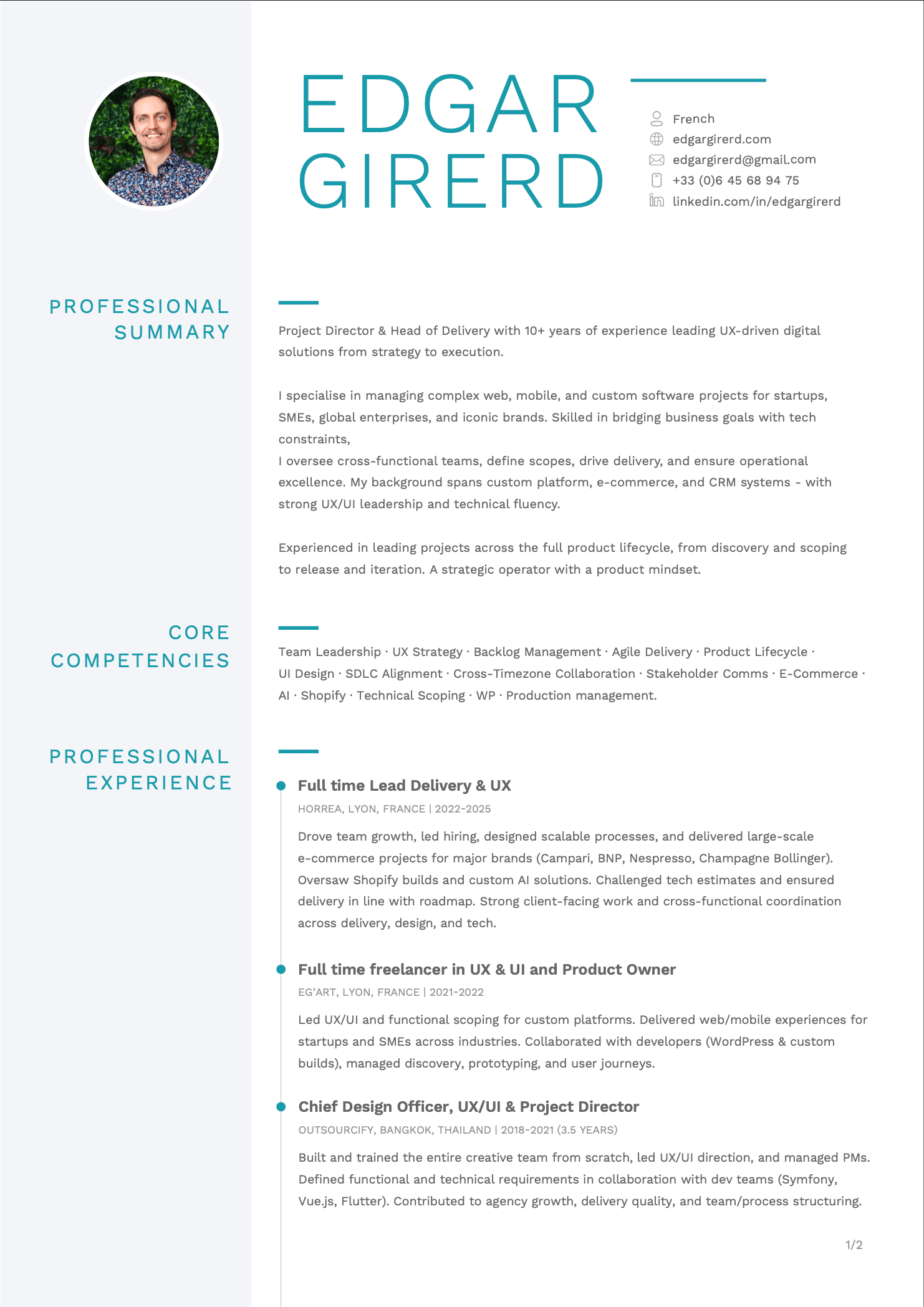 I am Edgar, UX & UI Lead and Project Director in UX-driven Software design solutions. I am based in Lyon (France) and I work for international customers, either being independents, startups and enterprises.